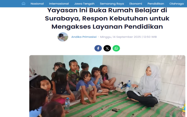 Surabaya โ Yayasan Novaloka Cakrawala Asa mendapat sorotan publik setelah kegiatan sosial dan pendidikannya diliput oleh SPI Media Kreatif. Dalam liputannya, SPI Media Kreatif menyoroti kiprah yayasan ini melalui Rumah Belajar Surabaya yang menjadi wadah pendidikan gratis dan ramah bagi anak-anak serta remaja.